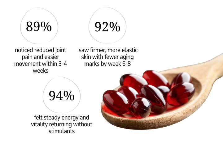 ✔ Collagen protection & skin renewal astaxanthin doesn't just sit on the surface - it builds up in your skin's lipid layer over 6-8 weeks, protecting existing collagen from breaking down and helping your skin rebuild its firmness and elasticity. You'll notice smoother texture, fewer aging marks, that natural sun-kissed glow, and the "you look so rested" compliments returning.