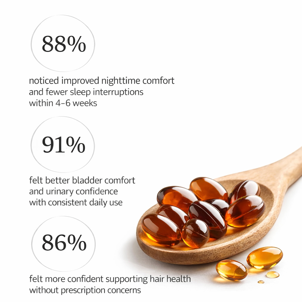 Take 3 Softgels Daily With Food - I know you've taken supplements that upset your stomach or never seemed to absorb. Take your dose with a meal containing healthy fats (eggs, avocado, nuts, olive oil)—these oils are fat-soluble and absorb way better with dietary fats. Most users split it: 2 softgels at breakfast, 1 at dinner—maintains steady DHT blocking and targets that nighttime urination destroying your sleep. No complicated timing or empty stomach rules. Just pop them with meals so your body absorbs the phytosterols and fatty acids that block DHT.